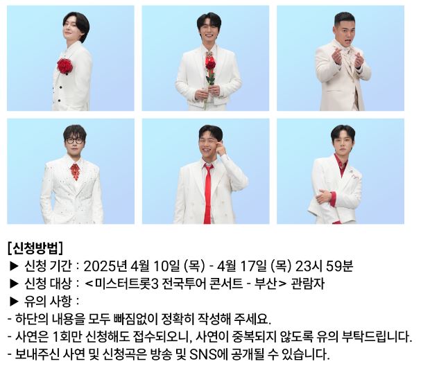 부산에서 단 이틀, 미스터트롯3 전국투어 콘서트가 펼쳐집니다! 트롯 팬이라면 놓칠 수 없는 이번 공연은 감동과 흥겨움이 넘치는 무대로 채워질 예정인데요. 좌석 매진이 빠르게 진행 중이니 망설이면 늦습니다. 지금 바로 예매 정보를 확인해보세요!