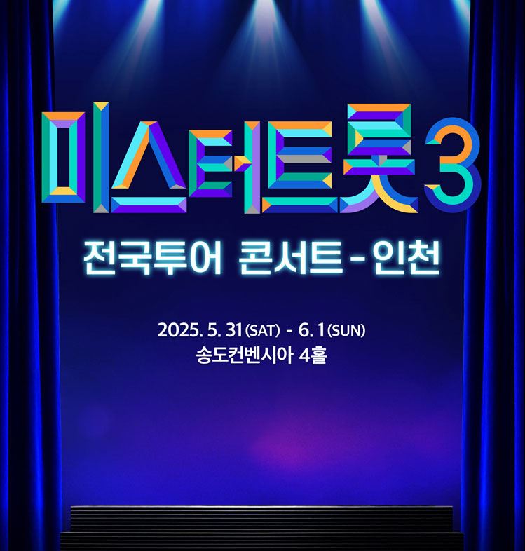 〈미스터트롯3〉 전국투어 콘서트가 인천 송도컨벤시아에서 2025년 5월 31일과 6월 1일, 단 이틀간 진행됩니다. 이번 공연은 120분 동안 이어지는 압도적인 무대 구성과 미스터트롯3의 화제의 주인공들이 직접 출연하여 생생한 라이브 퍼포먼스를 선보입니다.