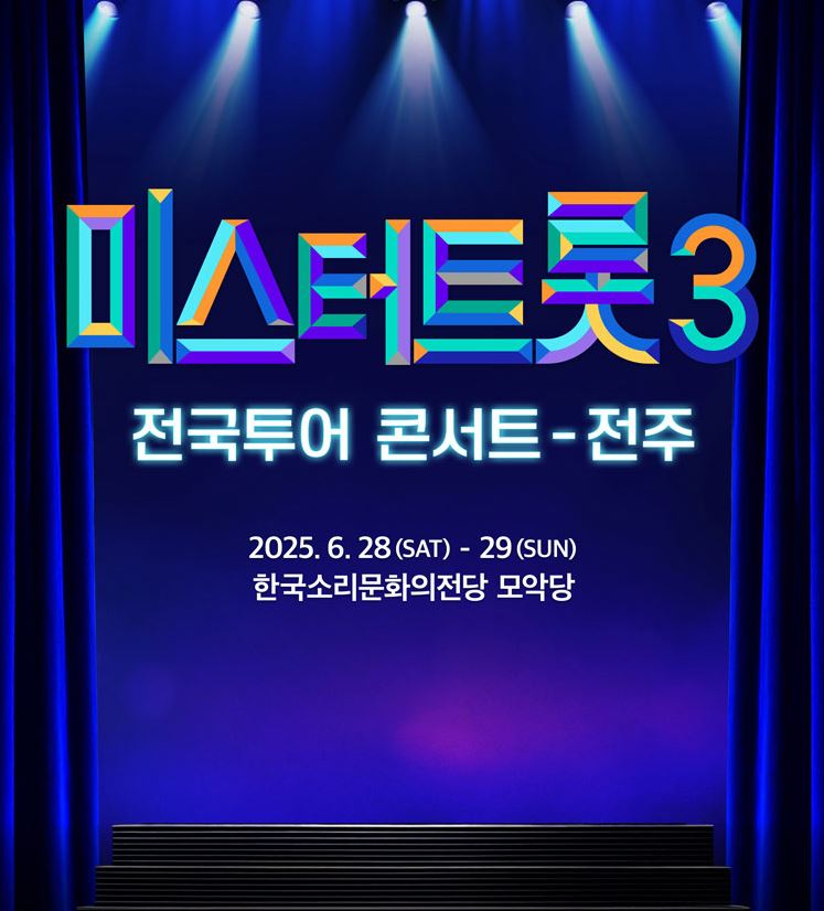 〈미스터트롯3〉 전국투어 콘서트는 전 세대를 아우르는 감동과 흥을 선사하는 무대로, 이번 전주 공연은 오는 6월 28일(토)과 29일(일), 한국소리문화의전당 모악당에서 진행됩니다. 총 3회차로 운영되며, 약 120분 동안 압도적인 라이브 무대가 이어질 예정입니다.