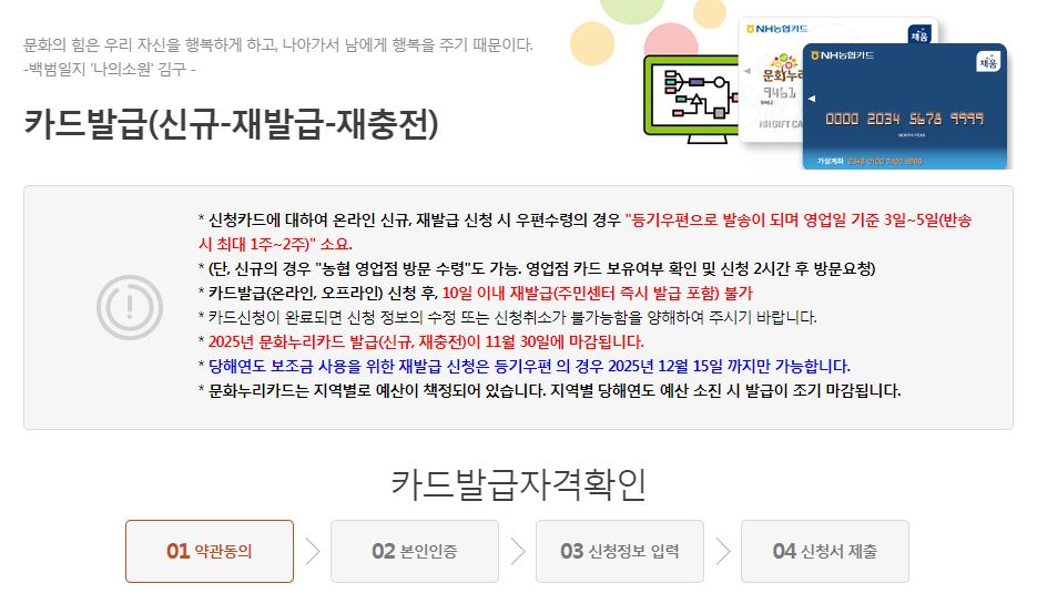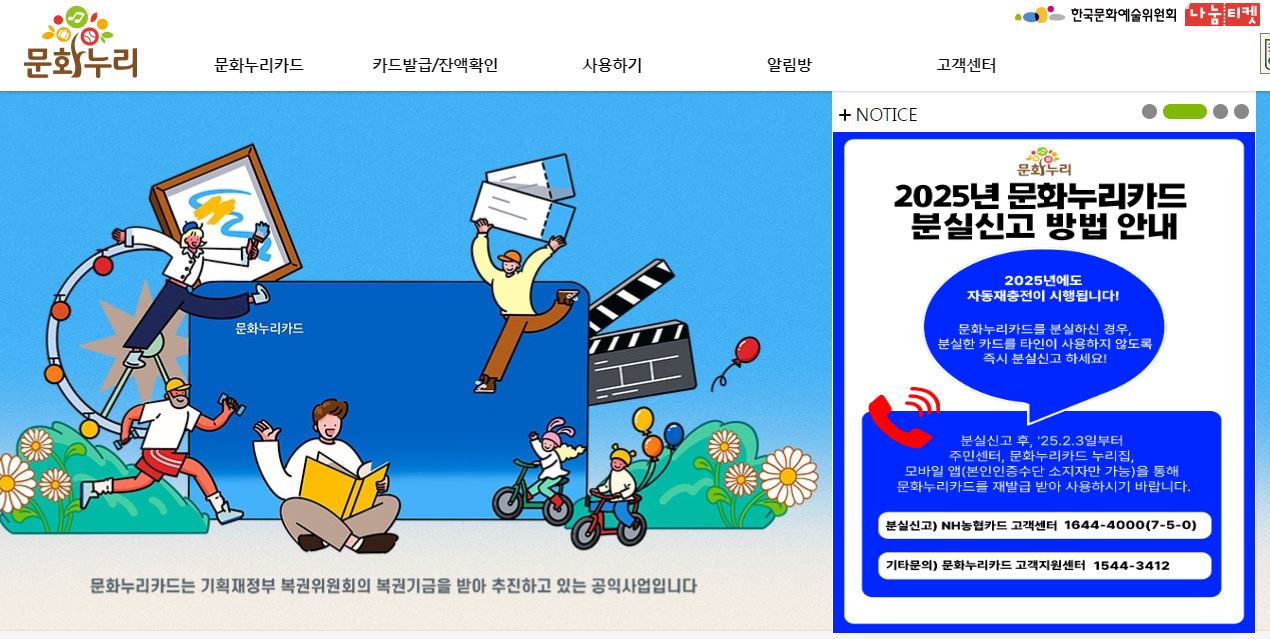 - 문화누리카드 고객센터(1544-3412) 또는 NH농협카드 고객센터(1644-4000)