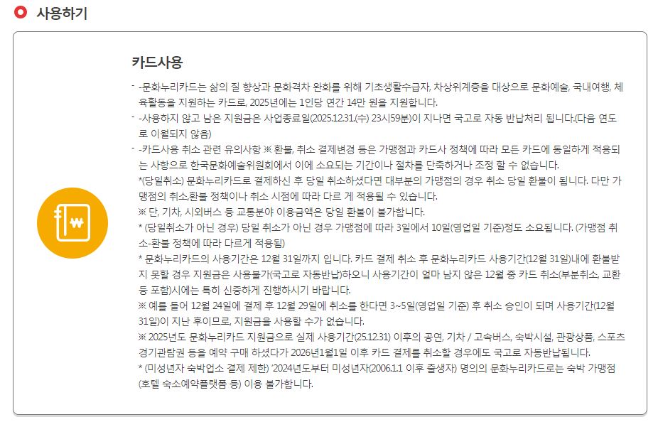 영화, 공연, 도서, 여행, 스포츠 등 다양한 분야에서 사용할 수 있으며, 사용하지 않은 금액은 이월되지 않으므로 기간 내에 사용해야 합니다.