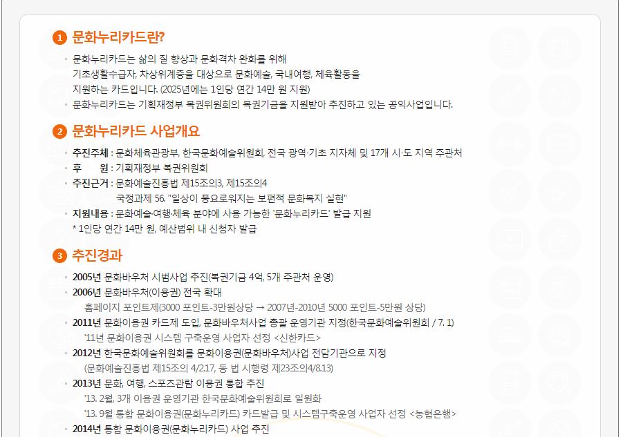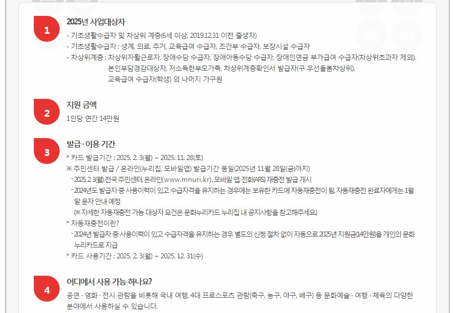 문화누리카드는 기초생활수급자 및 차상위계층에게 연간 14만 원의 문화·여행·체육 활동비를 지원하는 복지 바우처입니다.