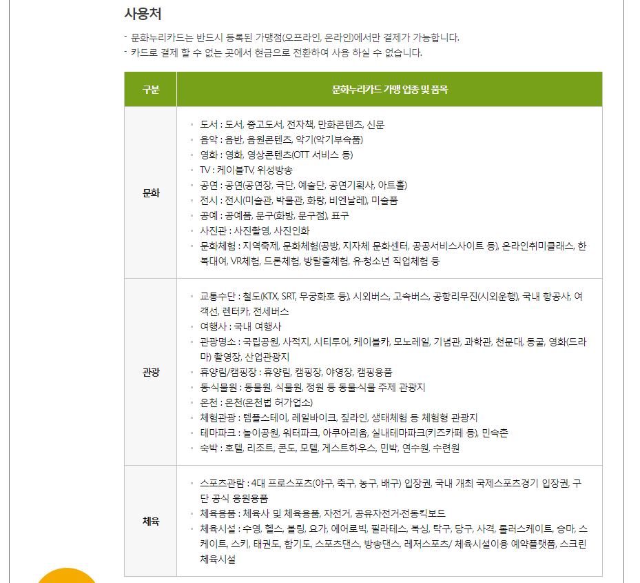 문화 분야: 도서, 음반, 영화, 공연, 전시, 공예, 사진관, 문화체험 등