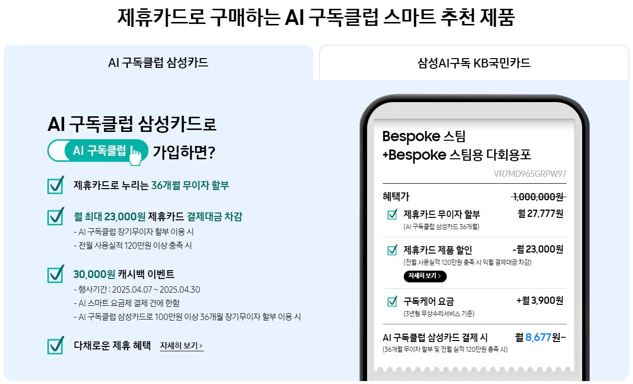 | AI 구독클럽 가입 | 월 최대 3.4만원 혜택 | KB국민카드 or 삼성카드 이용 |