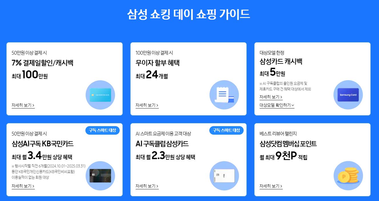 | 50만원 이상 결제 | 7% 캐시백 또는 결제일 할인 | 삼성카드 이용 시 |