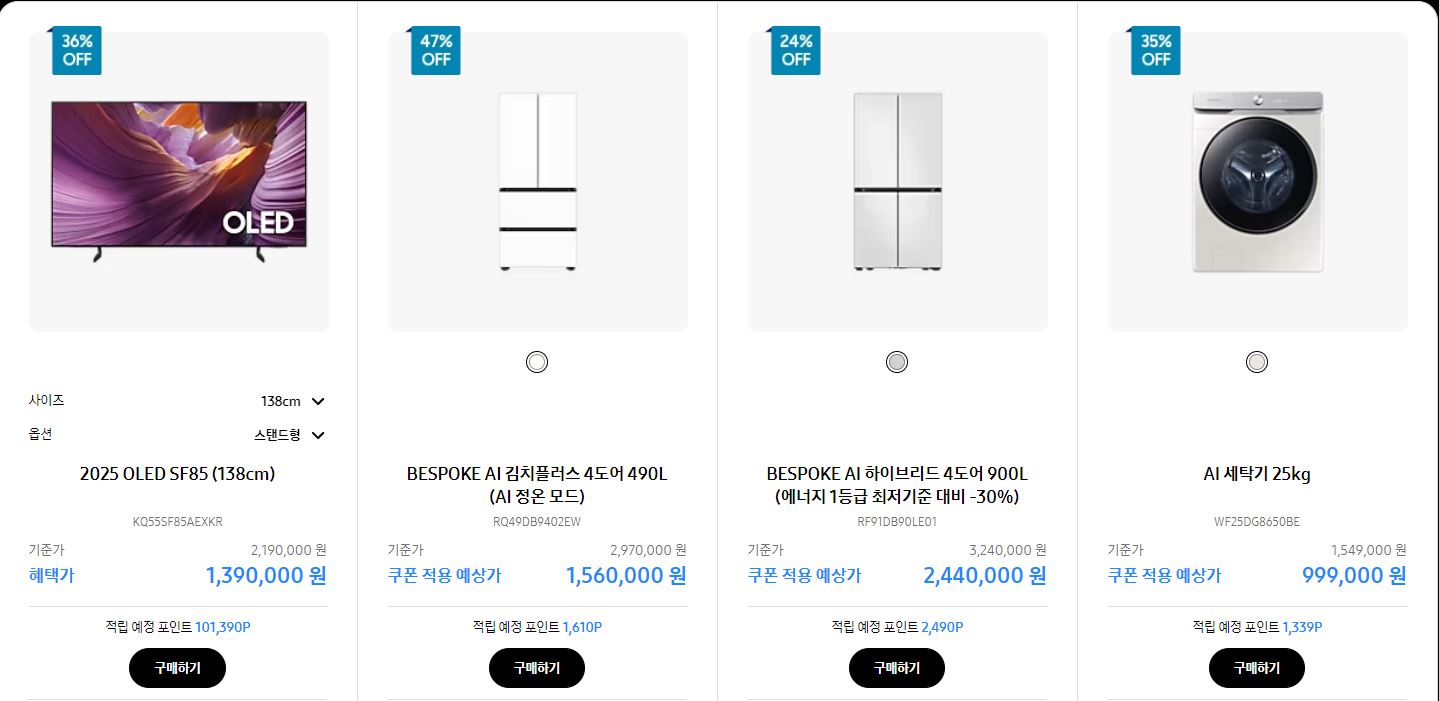 비스포크 냉장고, 갤럭시 S25, Neo QLED TV 등 인기 품목도 대거 포함됐습니다. 일부 모델은 일주일 한정 특가로 최대 47%까지 할인되며, 조기 품절 가능성이 있습니다.