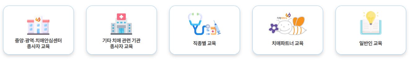 일반인부터 요양보호사까지 다양한 대상자를 위한 치매 교육 과정이 있으며, 온라인으로도 수강 가능합니다. 인지자극 프로그램, 보호자 돌봄 교육, 예방 교육 캠페인 등으로 구성되어 있습니다.
