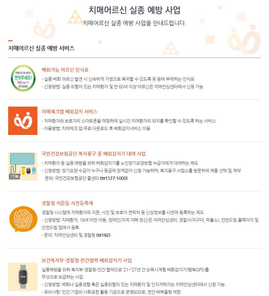 보건복지부 산하 기관인 중앙치매센터는 국가 차원의 치매관리정책을 총괄하며, 치매 환자와 가족들을 위한 통합 서비스를 제공합니다. 치매 어르신 찾기 예방 대처방법 등 센터는 전국 보건소 및 치매안심센터와 연계해 다양한 지원을 하며, 정기적인 교육과 자료 배포를 통해 치매 인식 개선에도 앞장서고 있습니다. 다양한 사업들이 있으니 들어가셔서 확인 해주세요